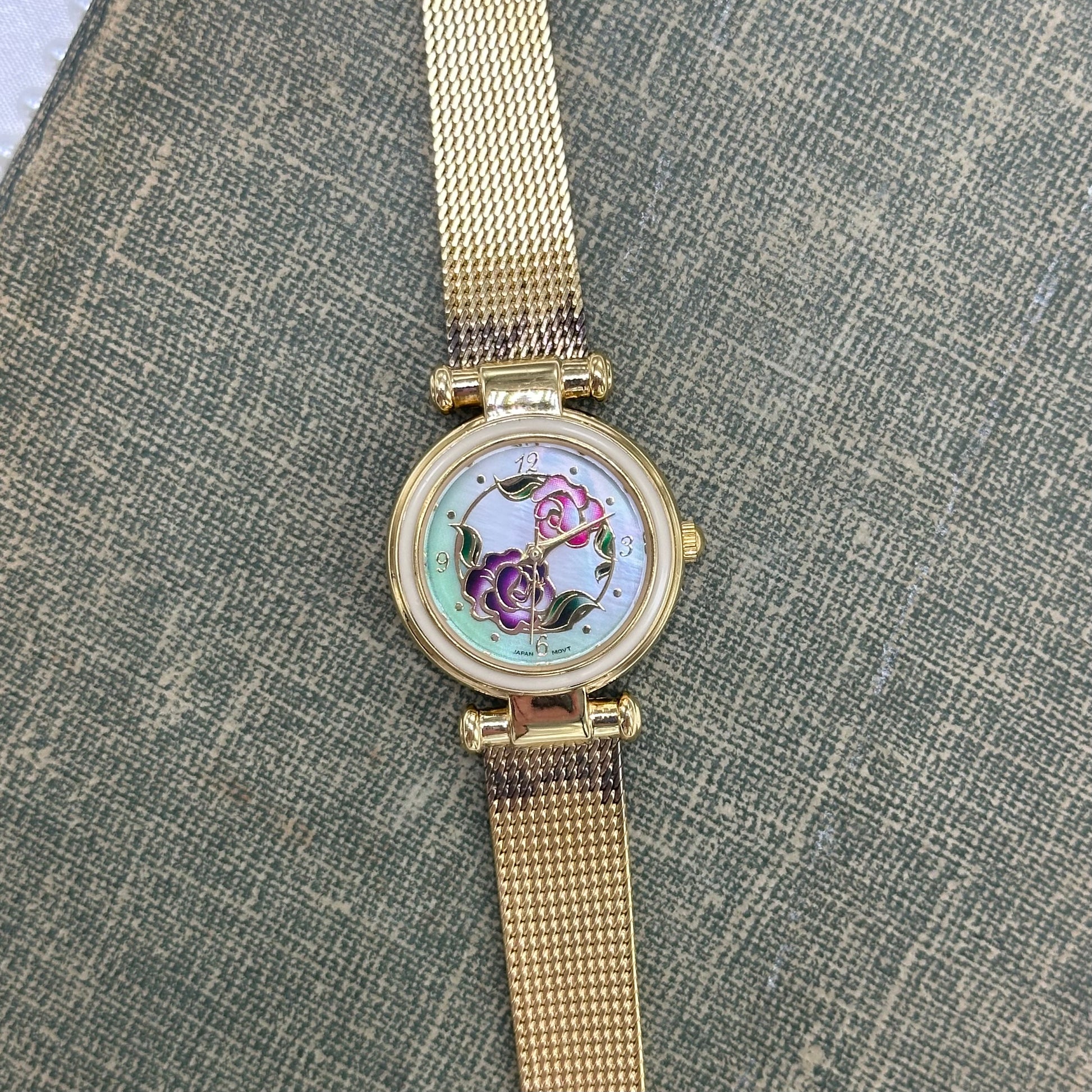 Vintage gold tone Avon watch with round flower dial and quartz movement.