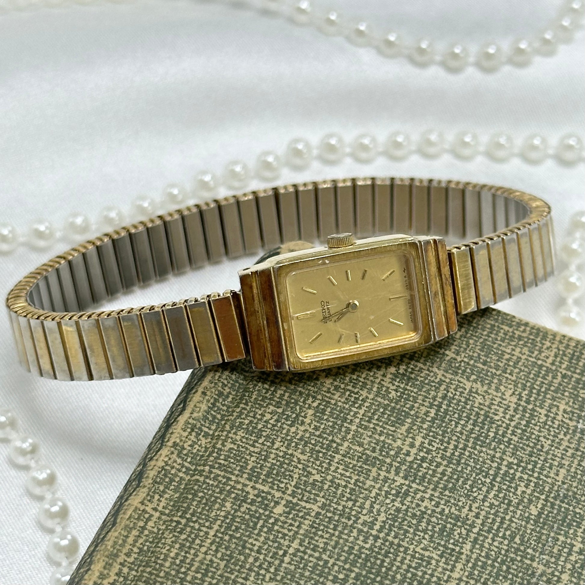 Vintage gold tone rectangle dial Seiko watch with quartz movement and stretchable band.