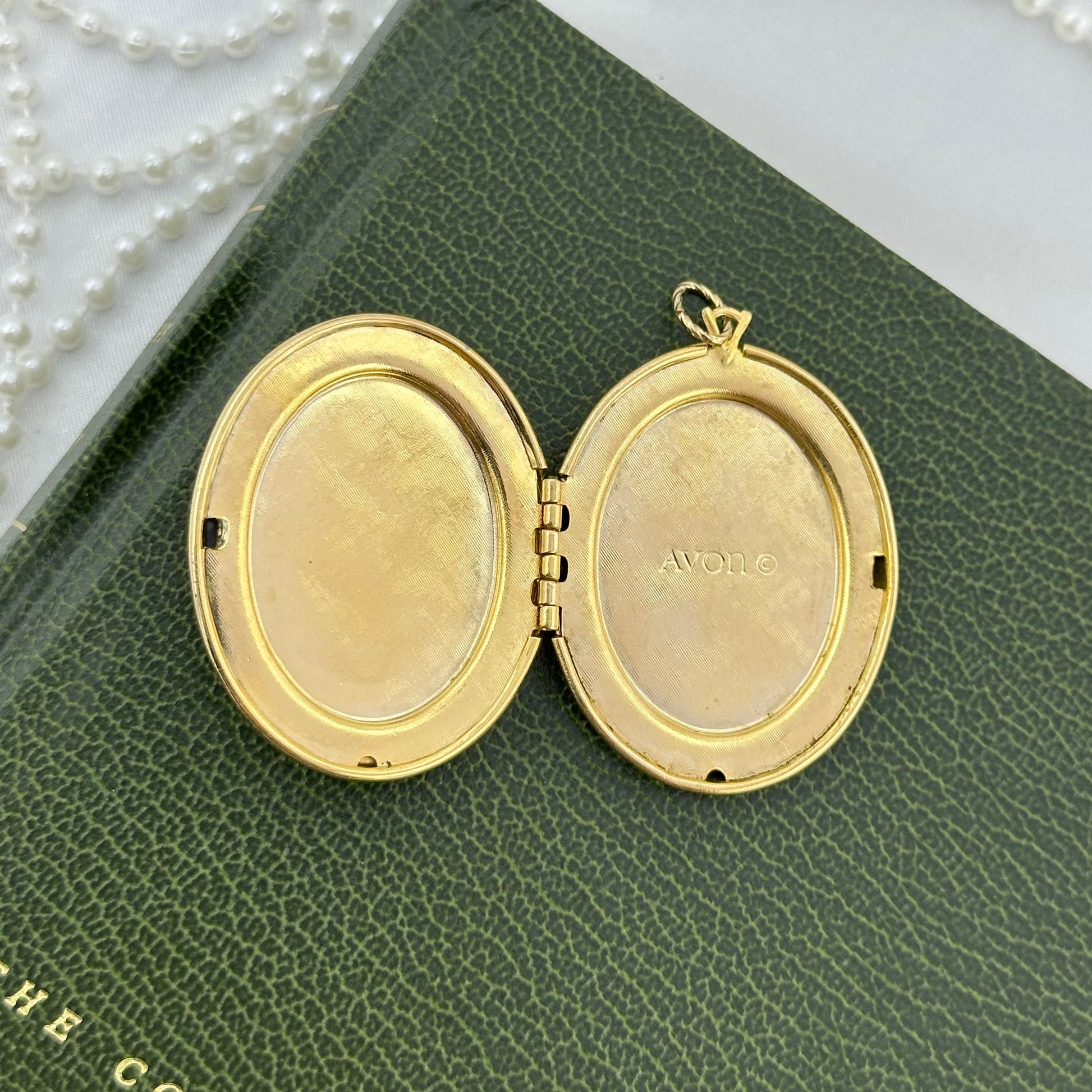 Vintage gold tone oval hanging photo locket by Avon with gorgeous blue and purple floral decal.