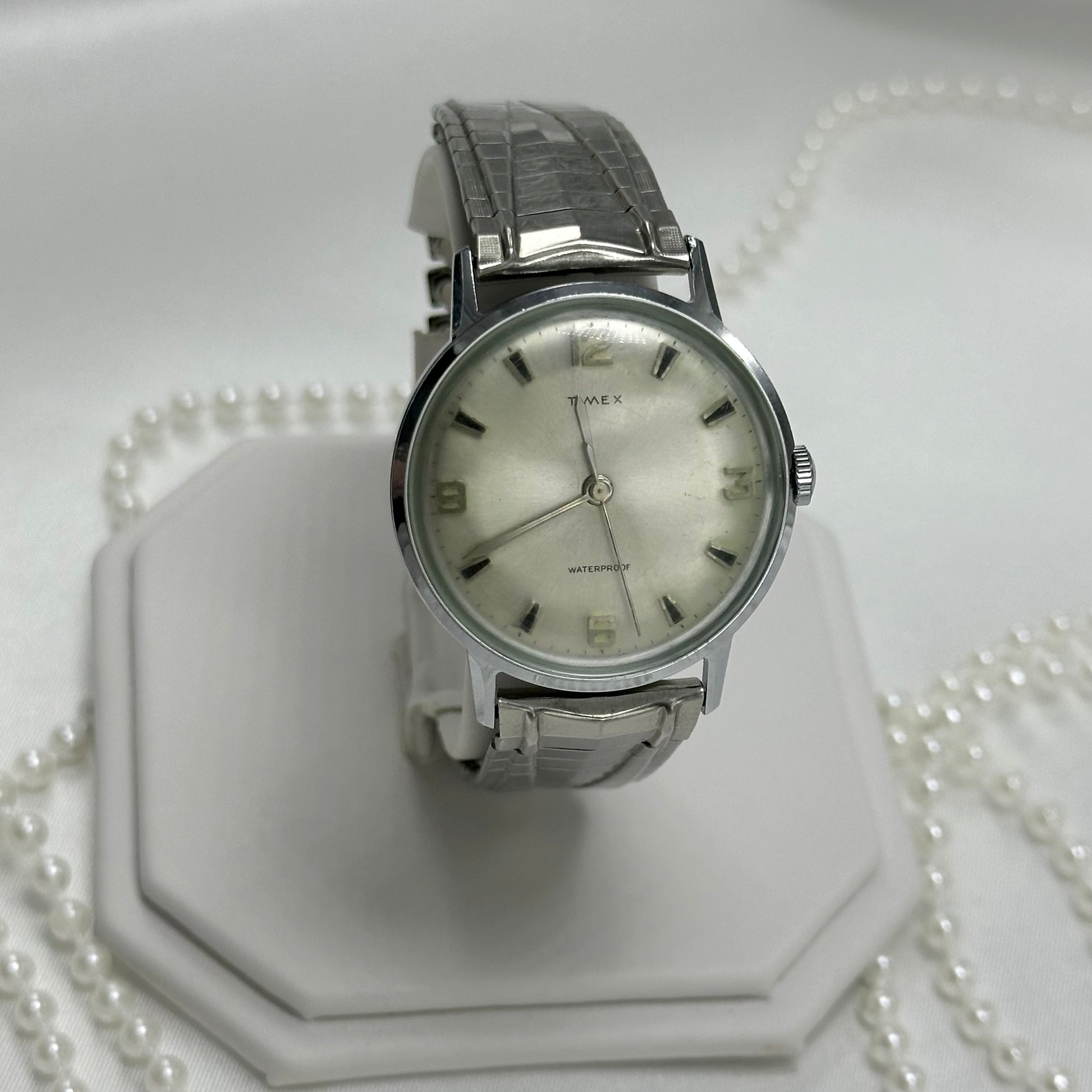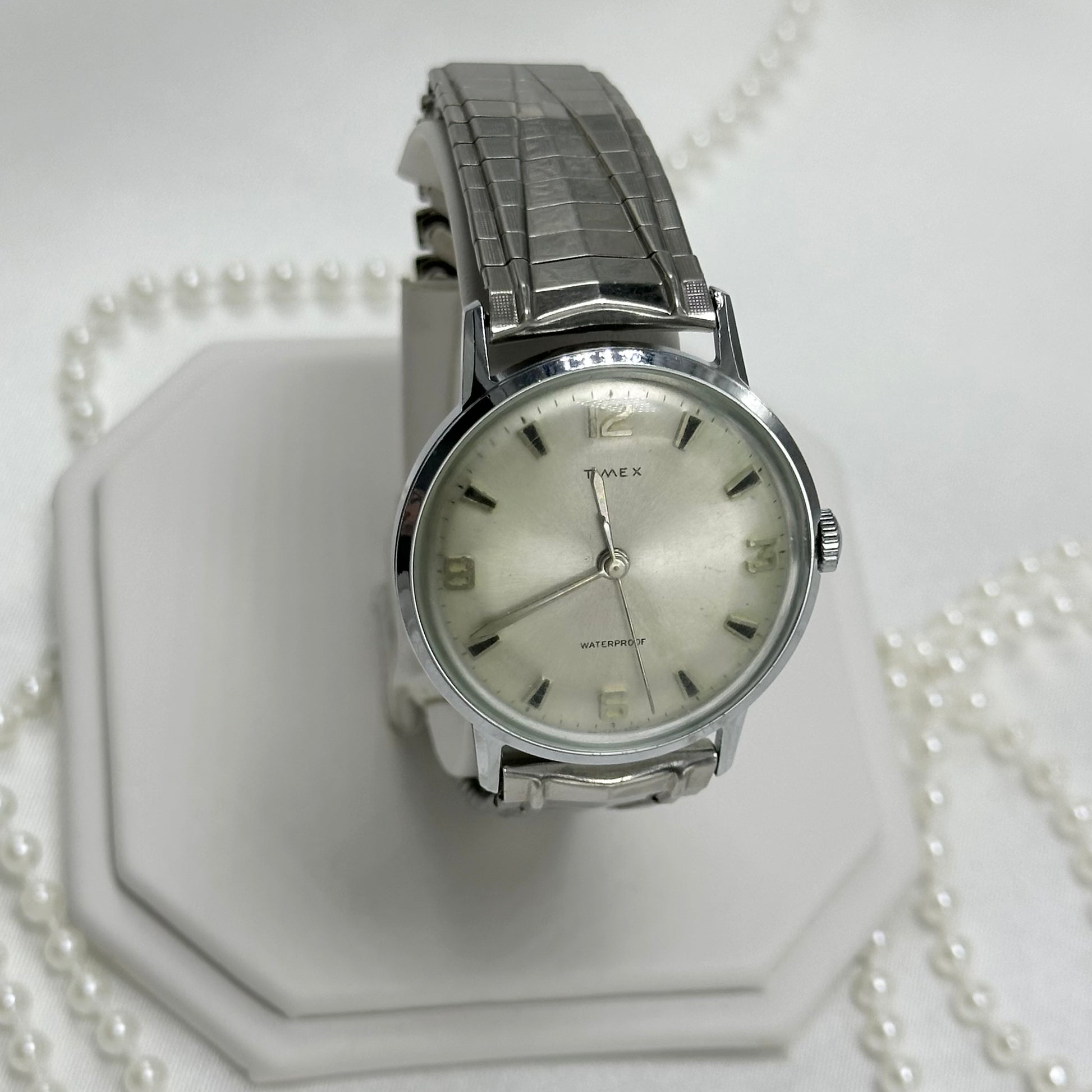 Vintage silver tone Timex manual winding watch with unique stretchable band. Crystal is slightly fogged.
