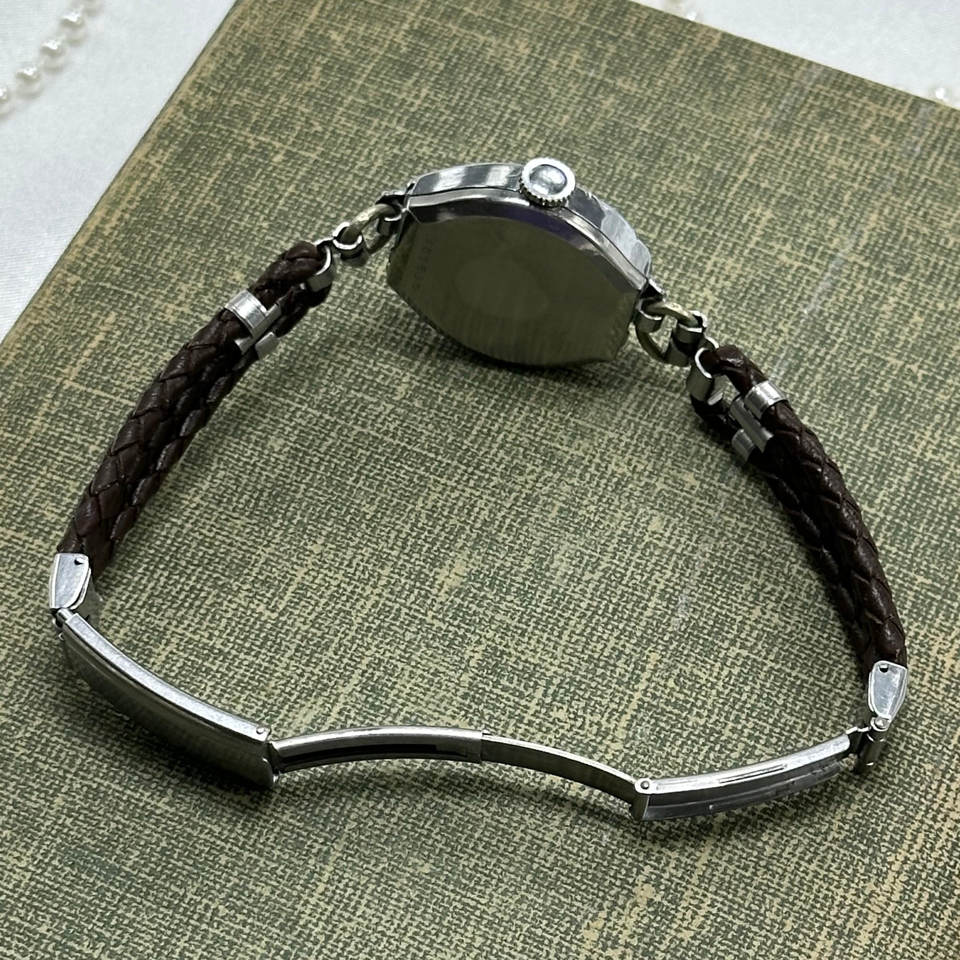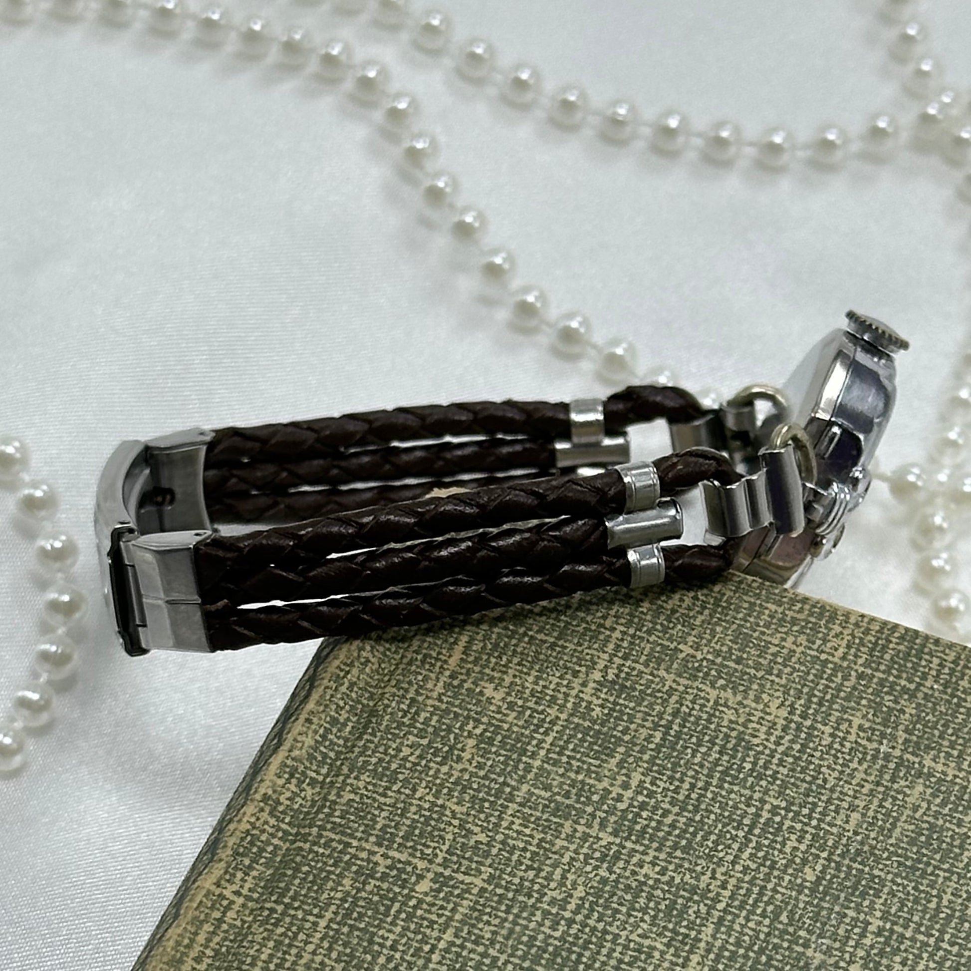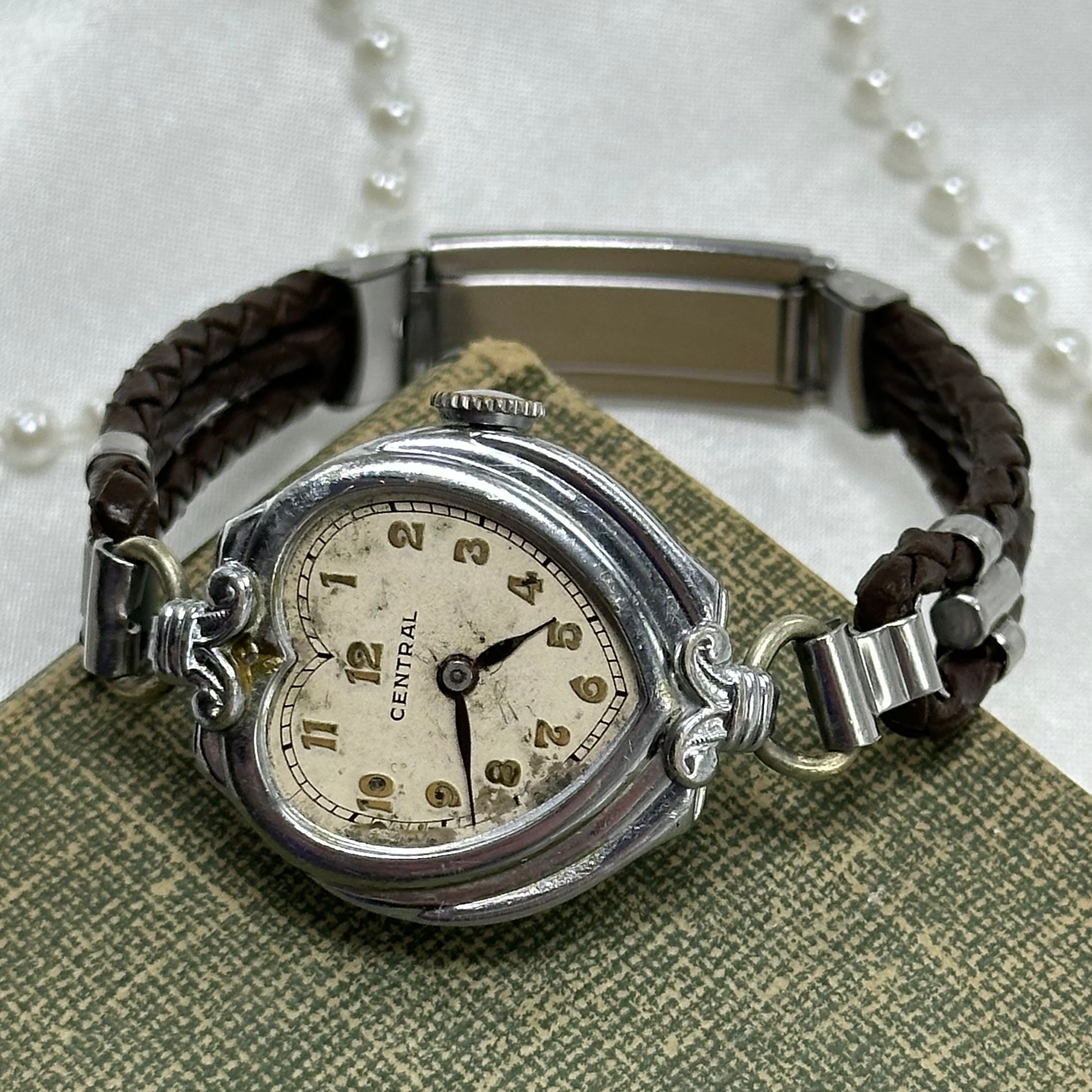 Vintage 1930's Silver Wind-Up Heart Watch with Brown Braided Leather Band