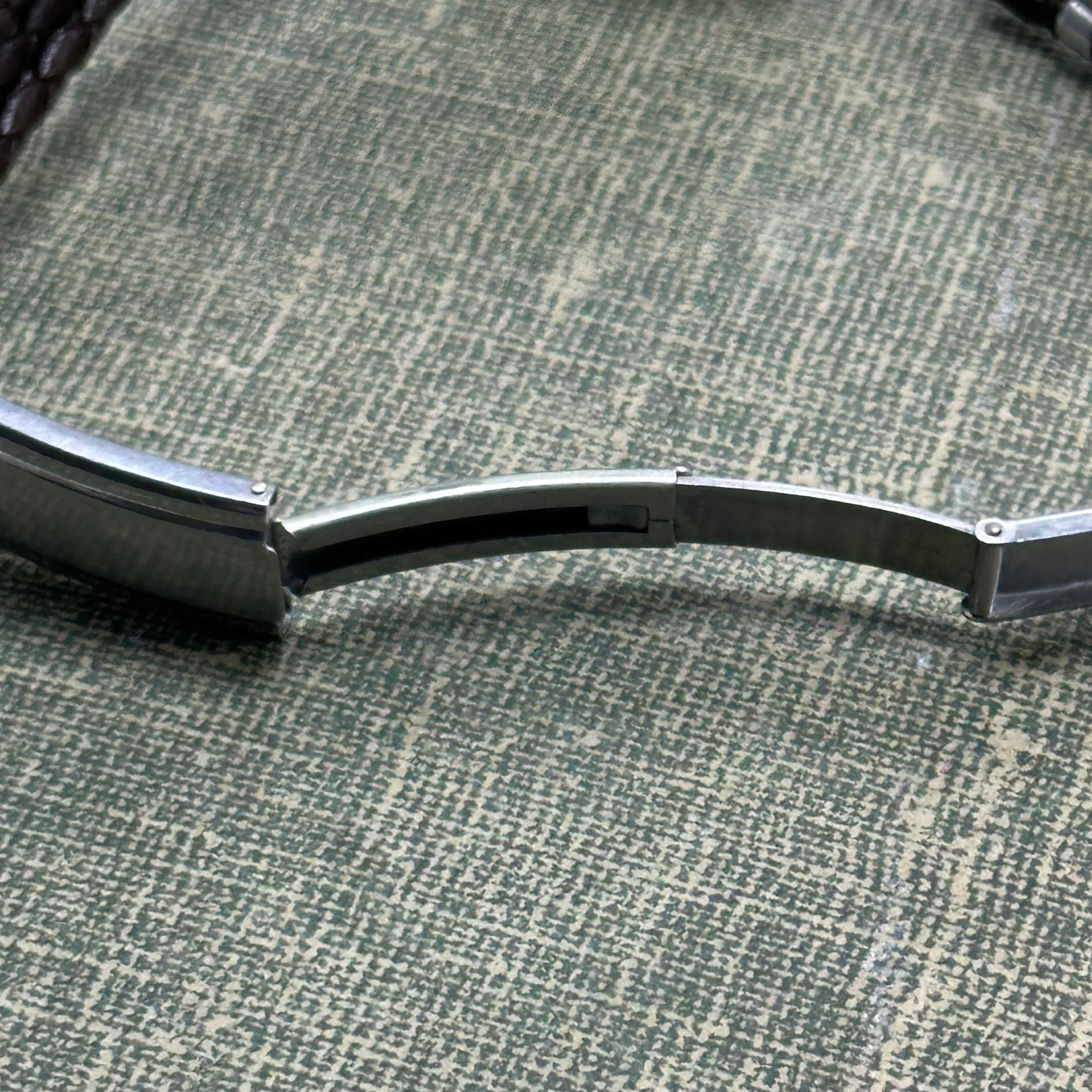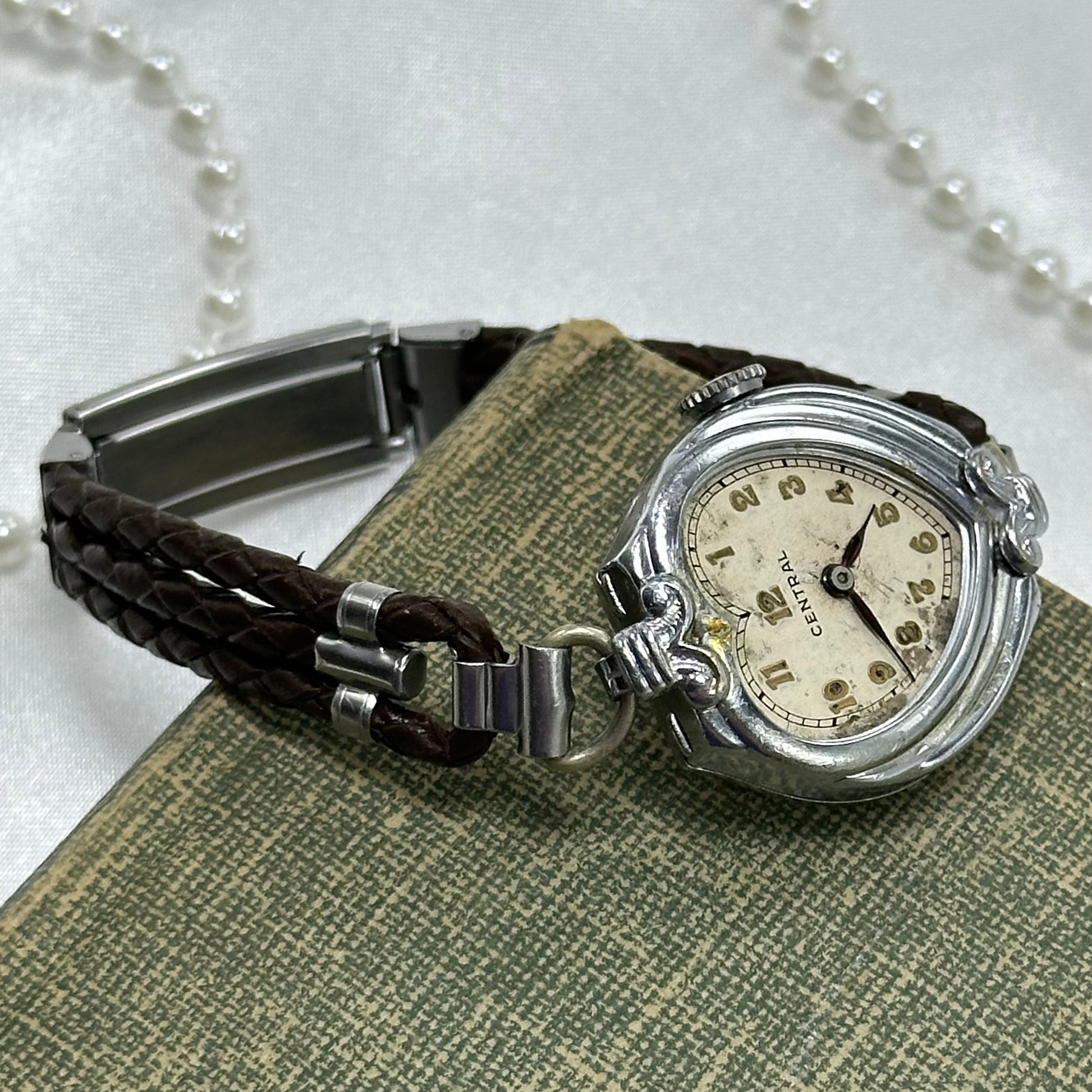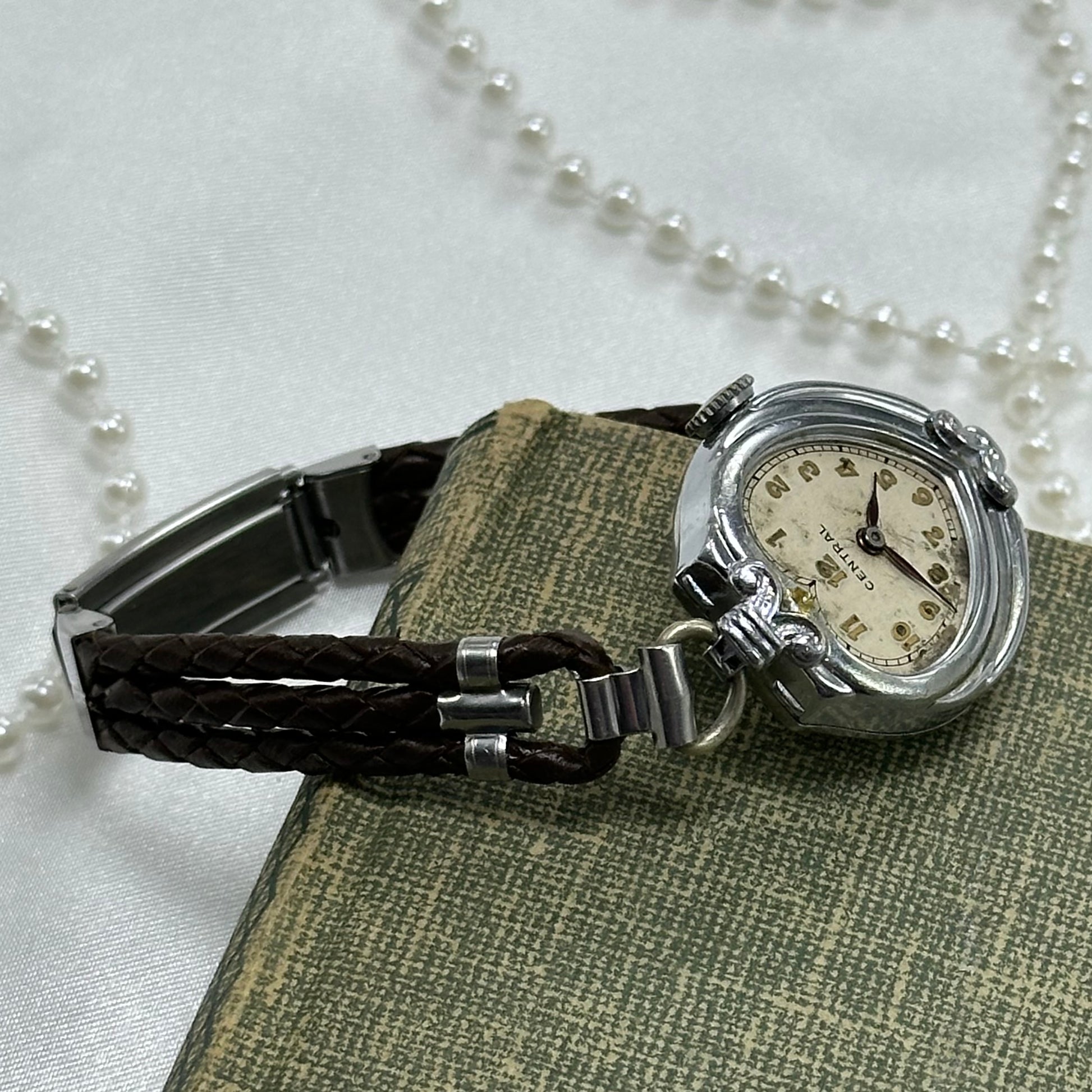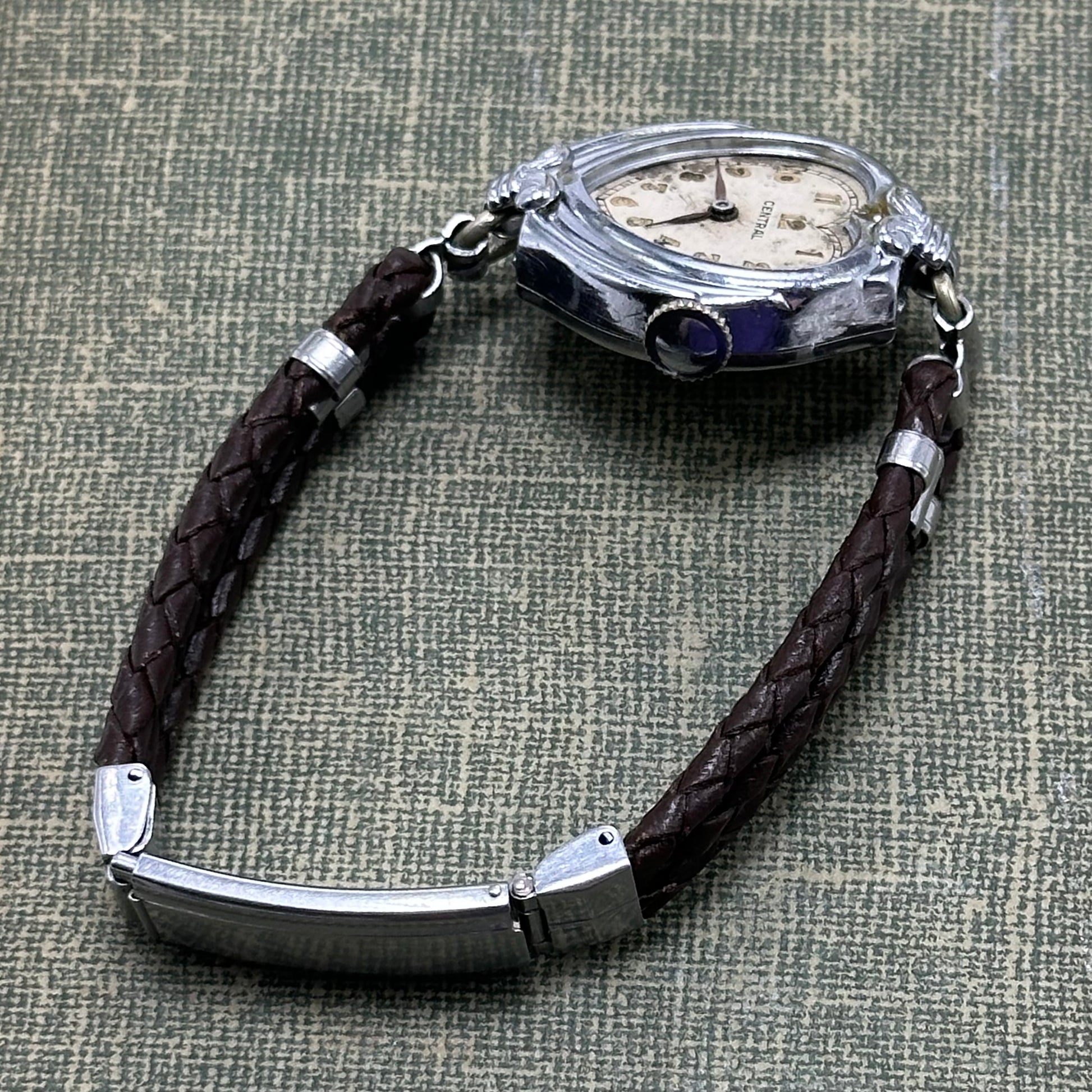 Vintage silver tone Central manual winding watch from the 1930's with gold numbers and newly replaced brown leather 3 strand braided band. Missing the crystal.