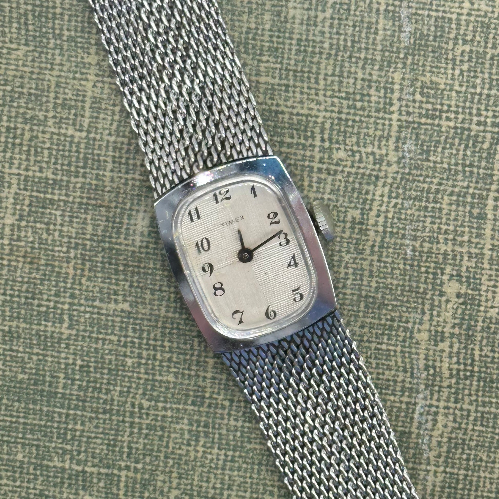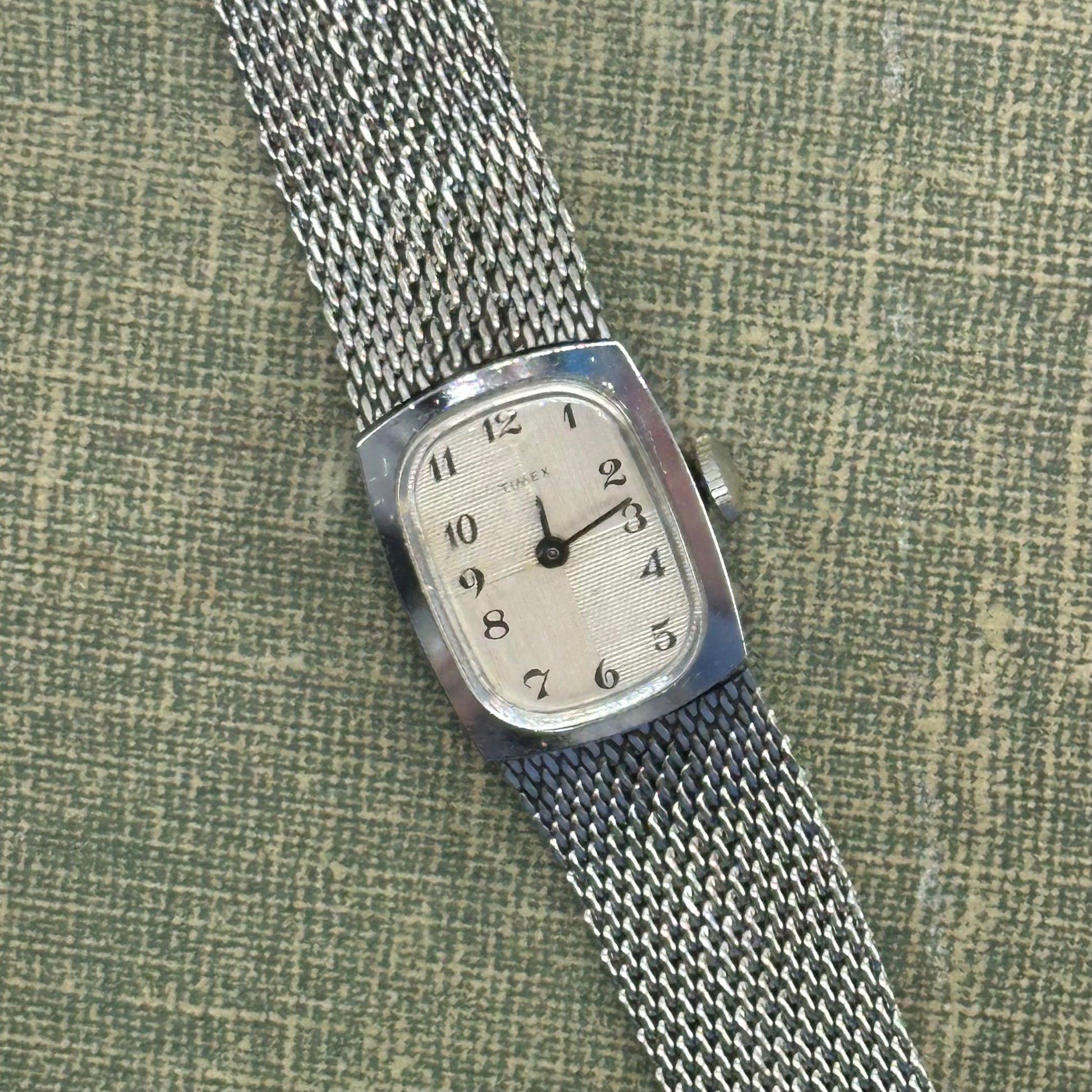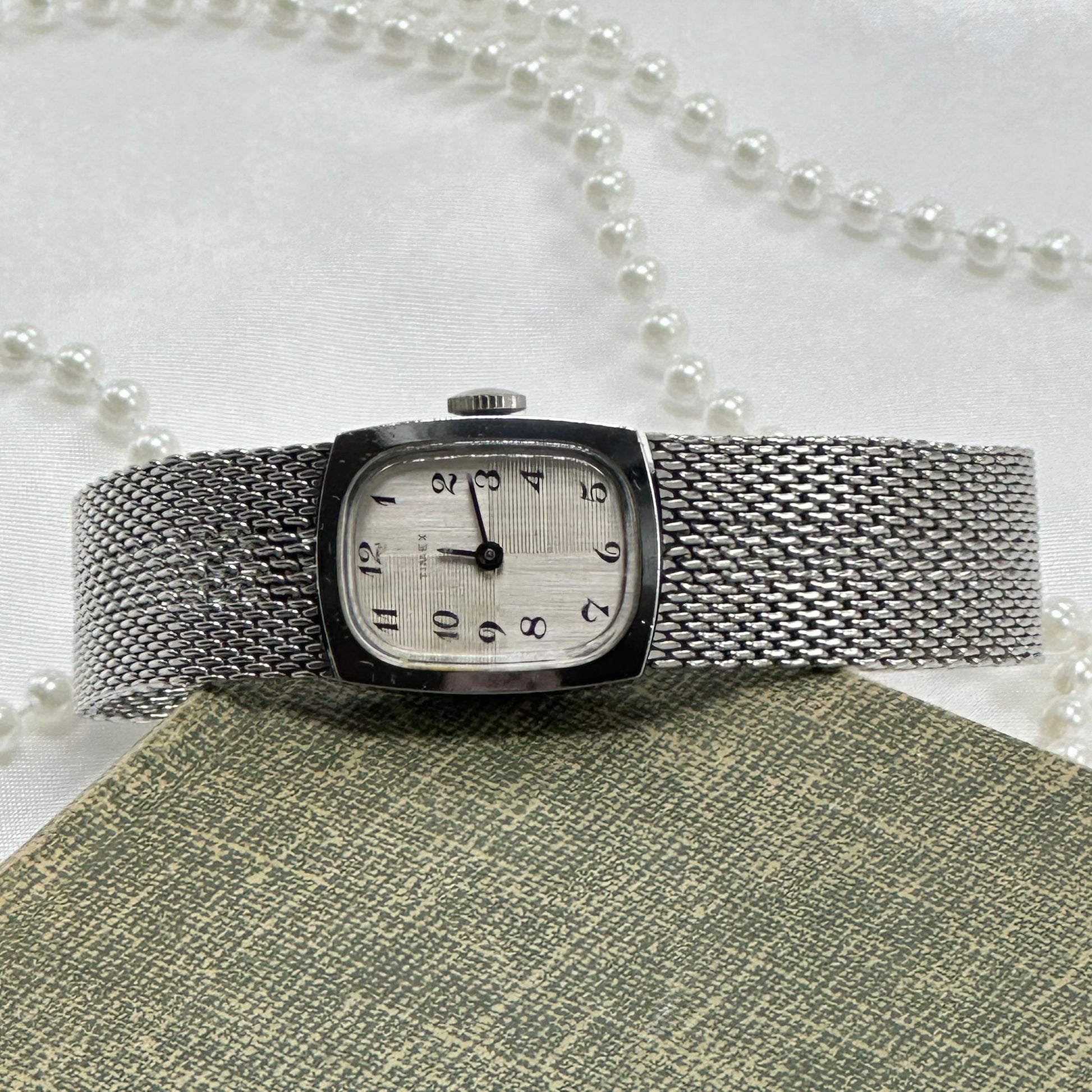 Vintage silver tone mechanical winding Timex watch with mesh band.