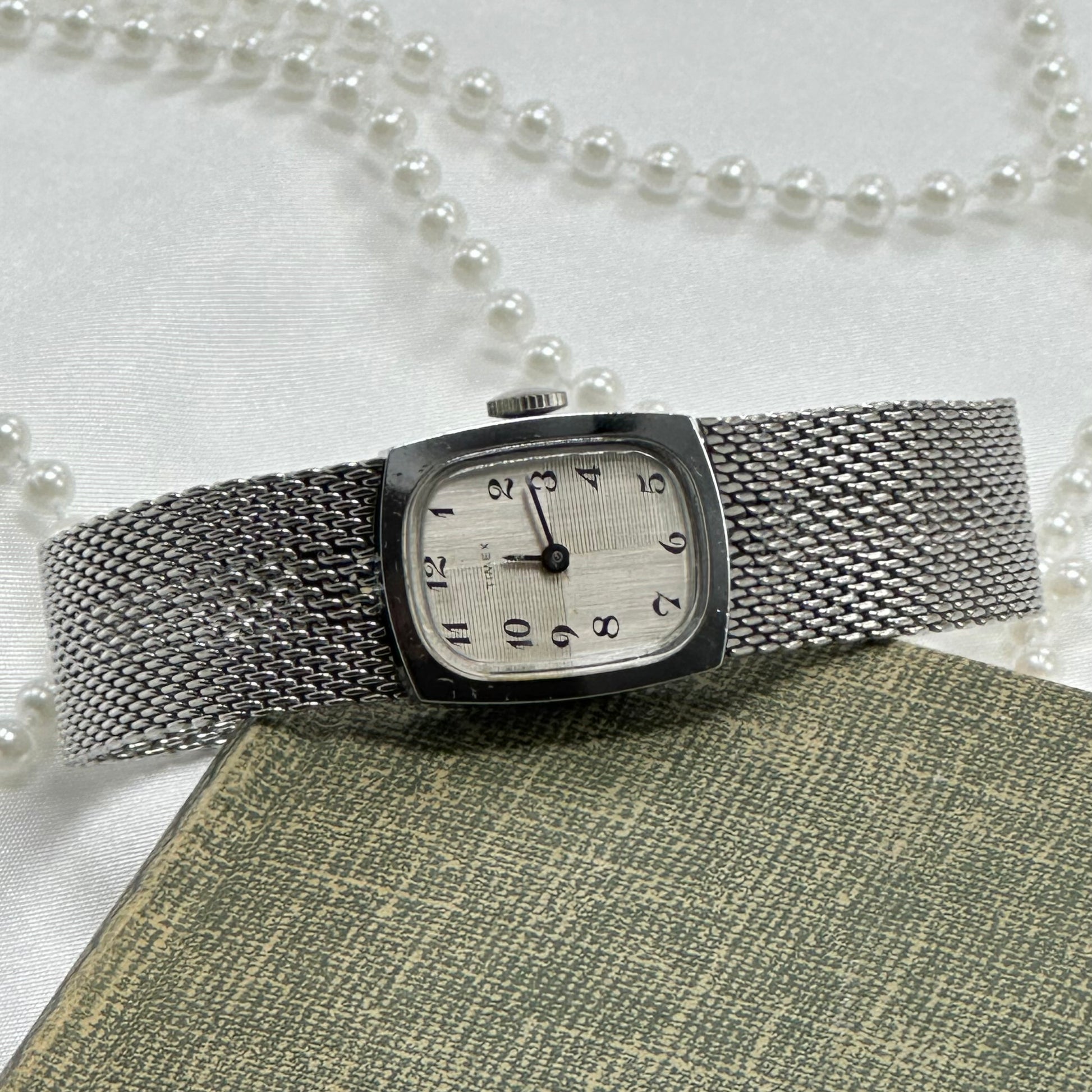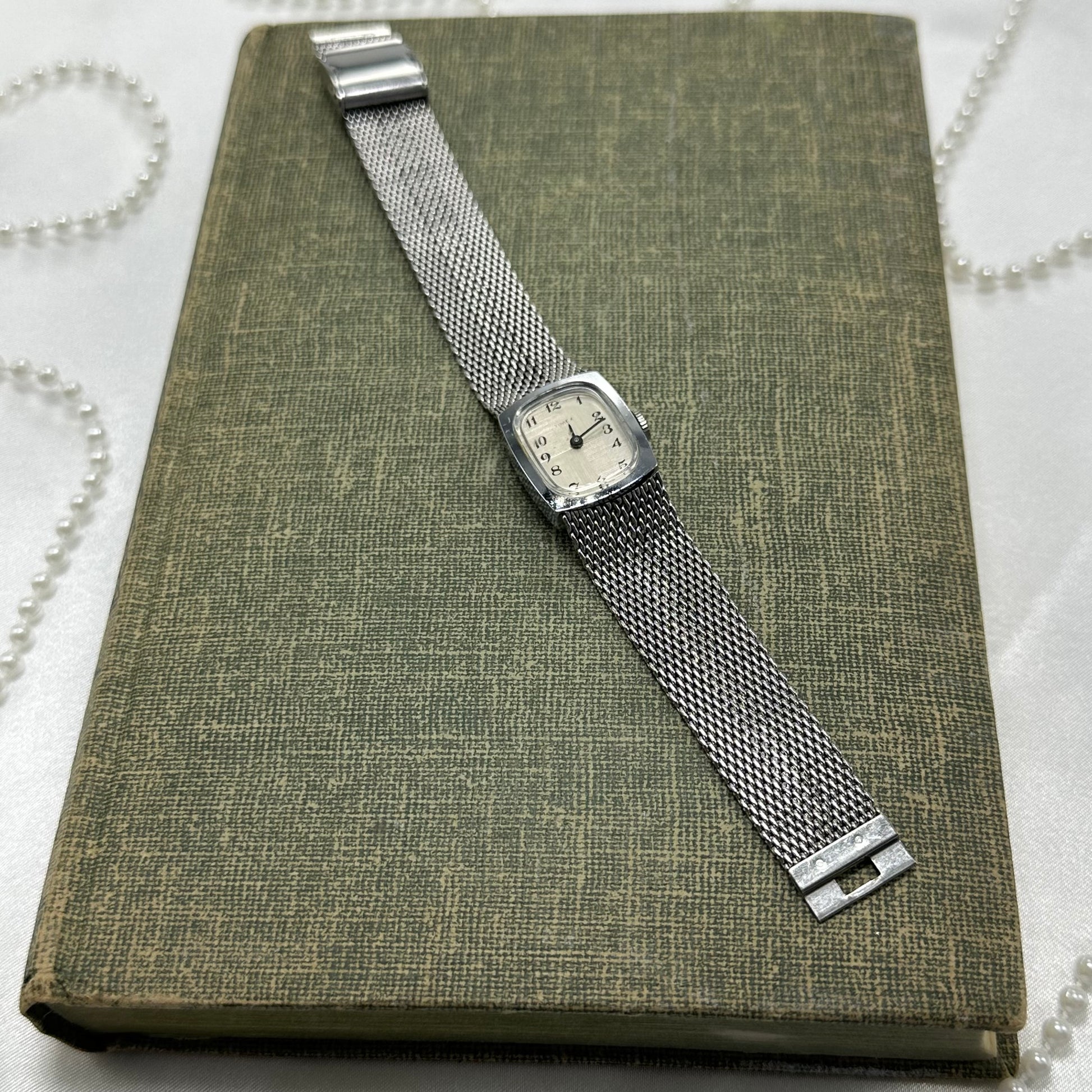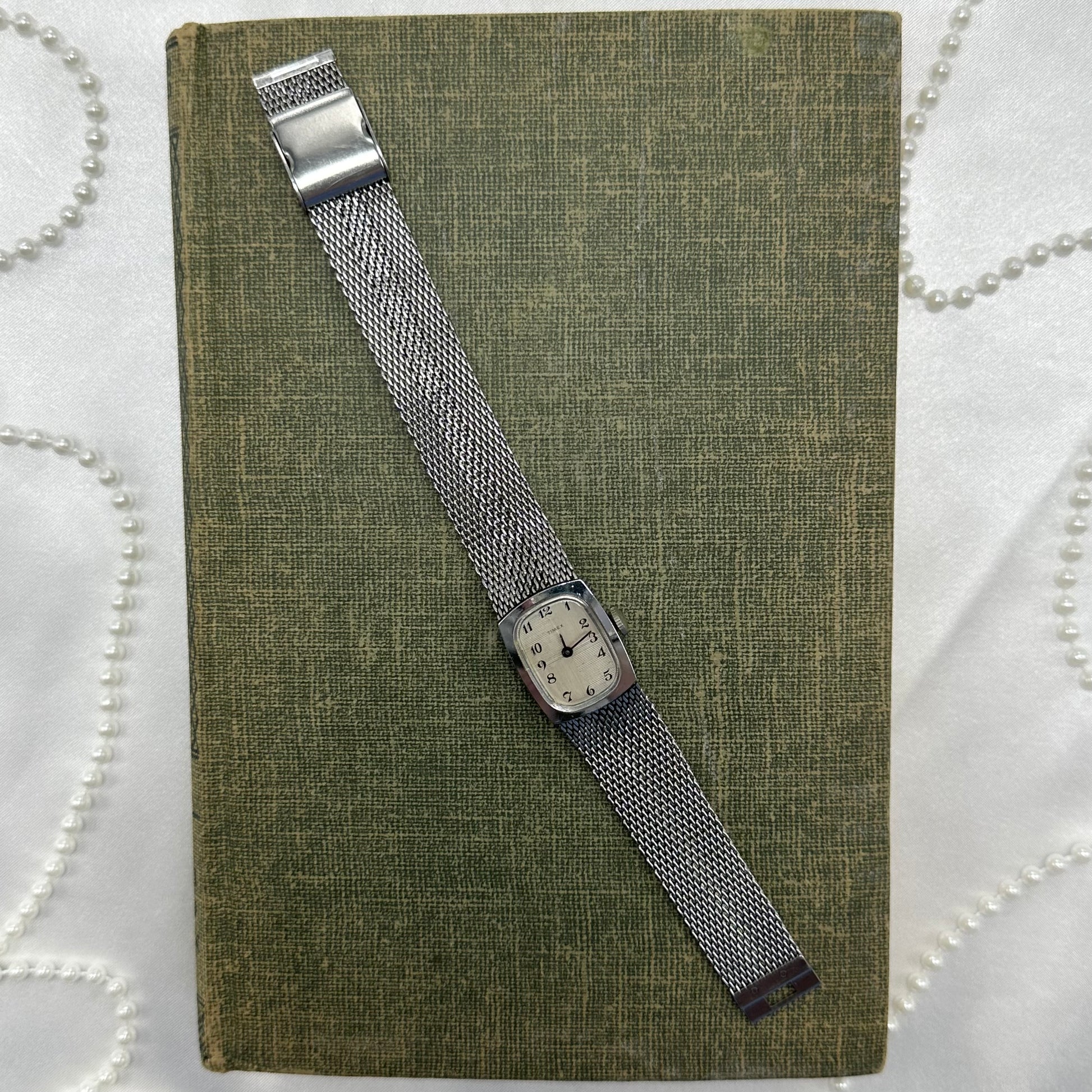 Vintage silver tone mechanical winding Timex watch with mesh band.