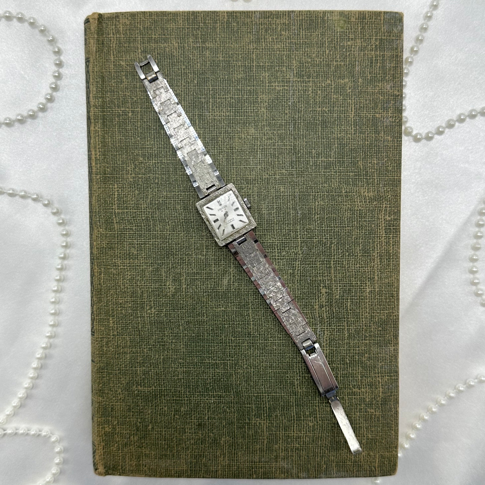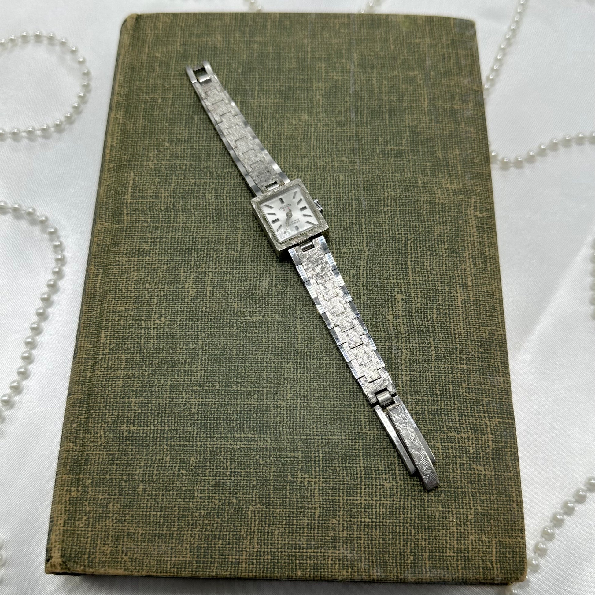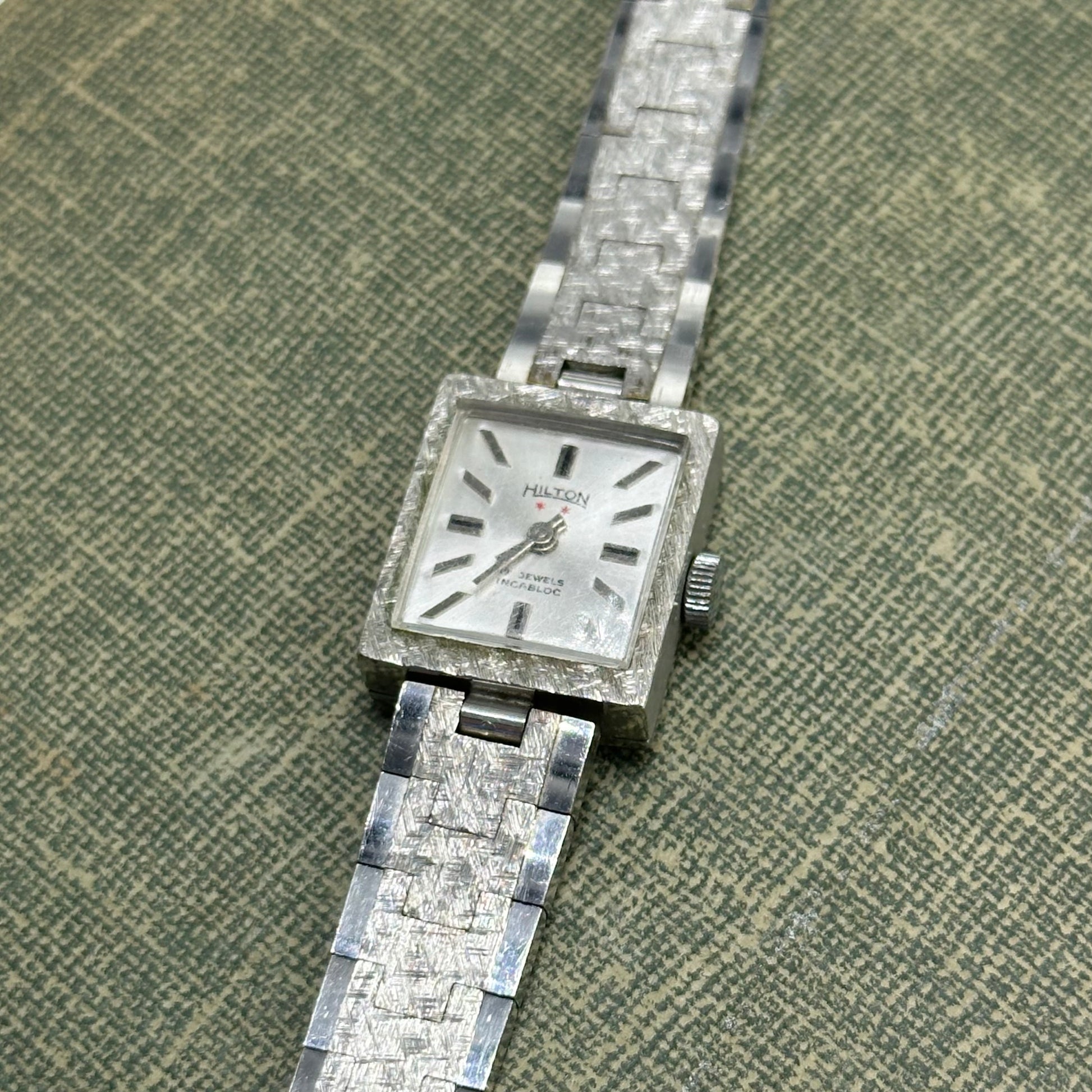 Vintage silver tone manual winding Hilton 17 jewels watch with clasp band. Chrome plated diamond cut link bracelet band.